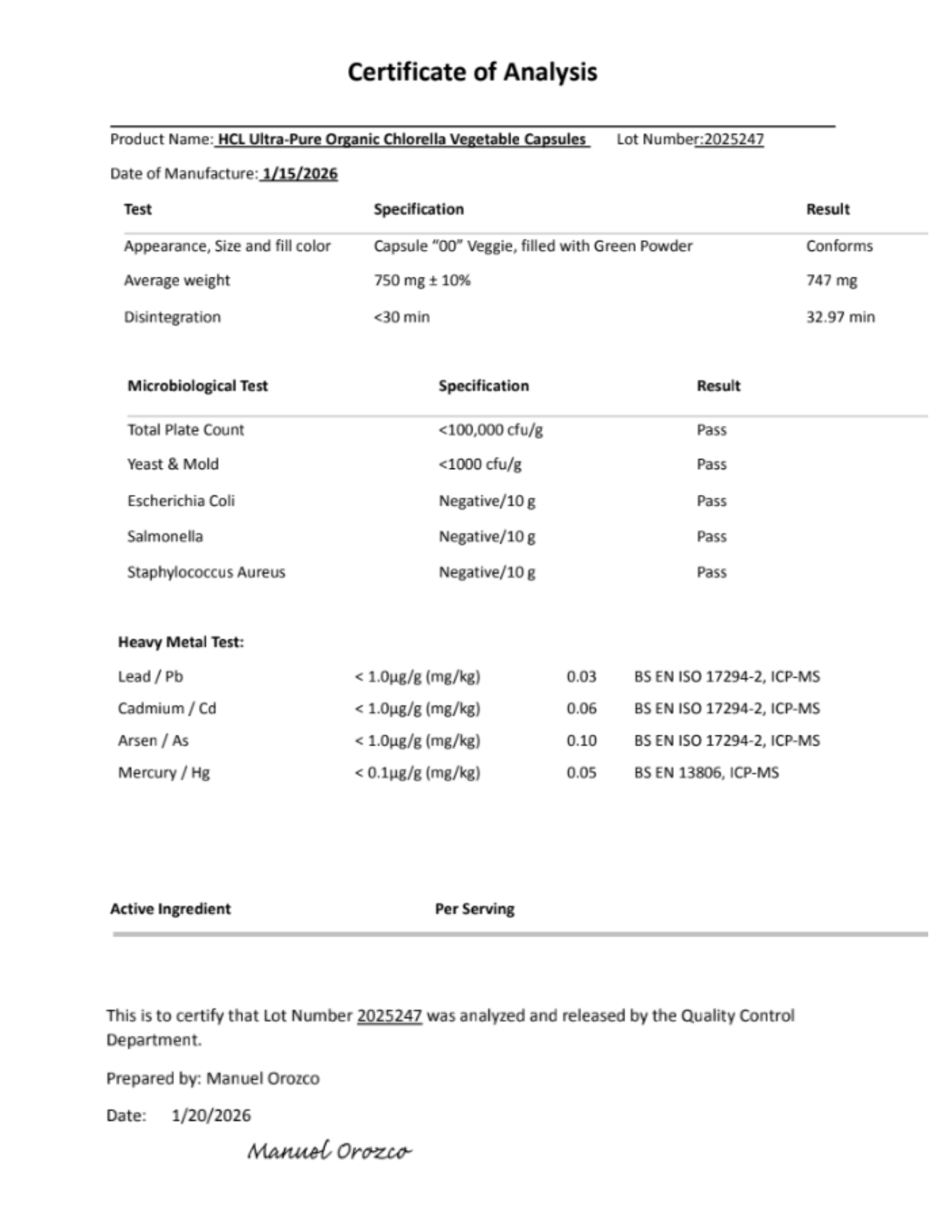 ✔️ Uncontaminated, Non-Irradiated, Ultra-Pure Chlorella — harvested from oxygen-rich, pollution-free water sources.